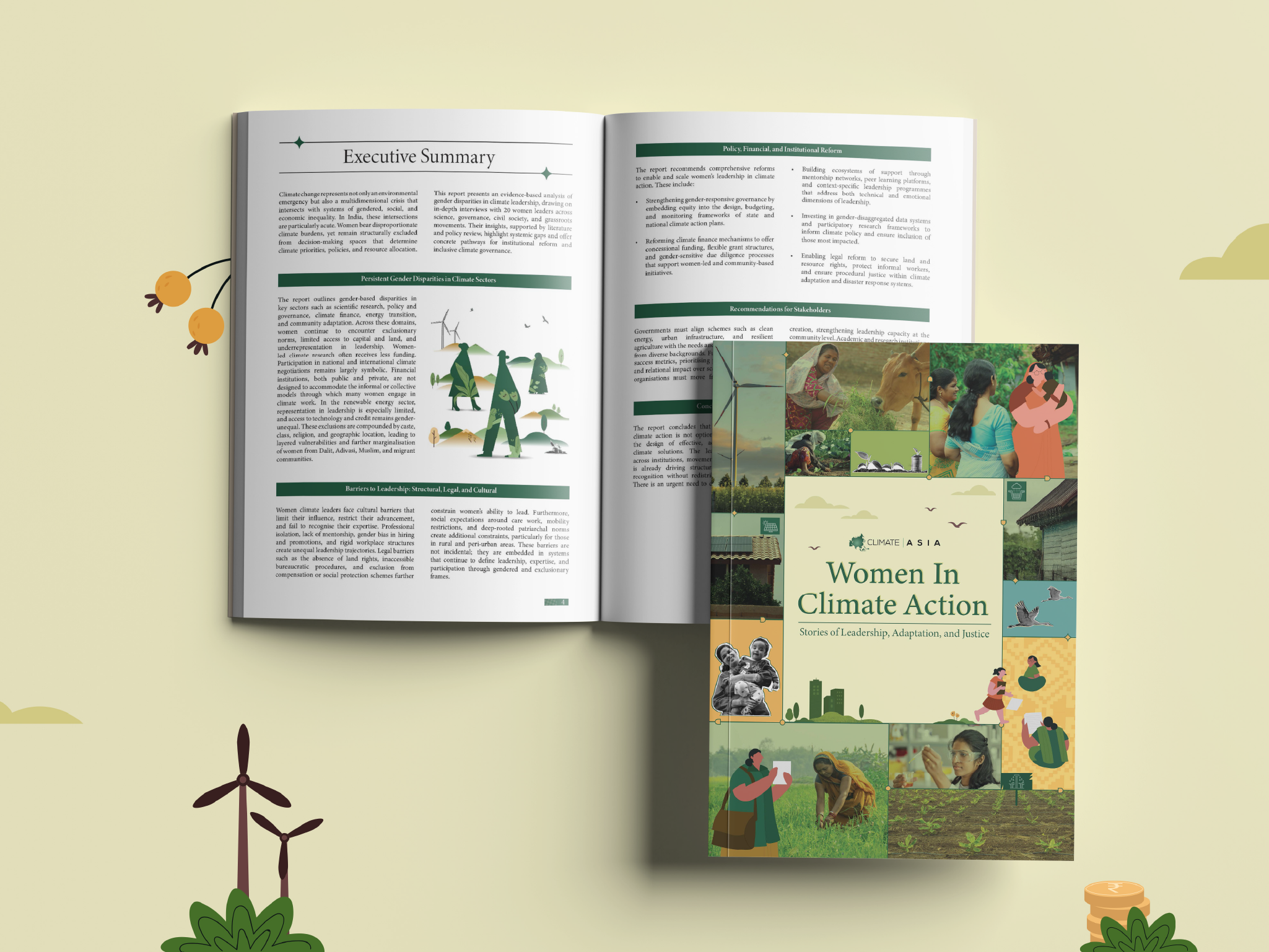 Climate Asia | Report DesignThis editorial design project for Climate Asia focuses on the intersection of gender disparities and climate resilience. The report analyzes structural barriers to women’s leadership while highlighting solution-oriented approaches derived from interviews with 20 women leaders across science, governance, and grassroots sectors. By centering lived experiences and the Sustainable Livelihoods Framework, the publication provides a strategic roadmap for institutional and financial reforms to foster inclusive climate governance.