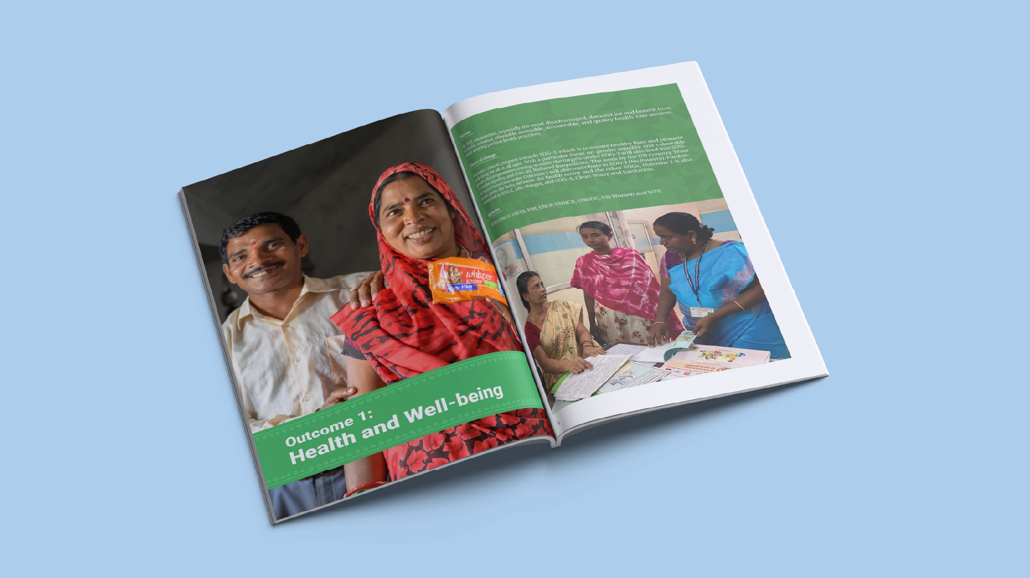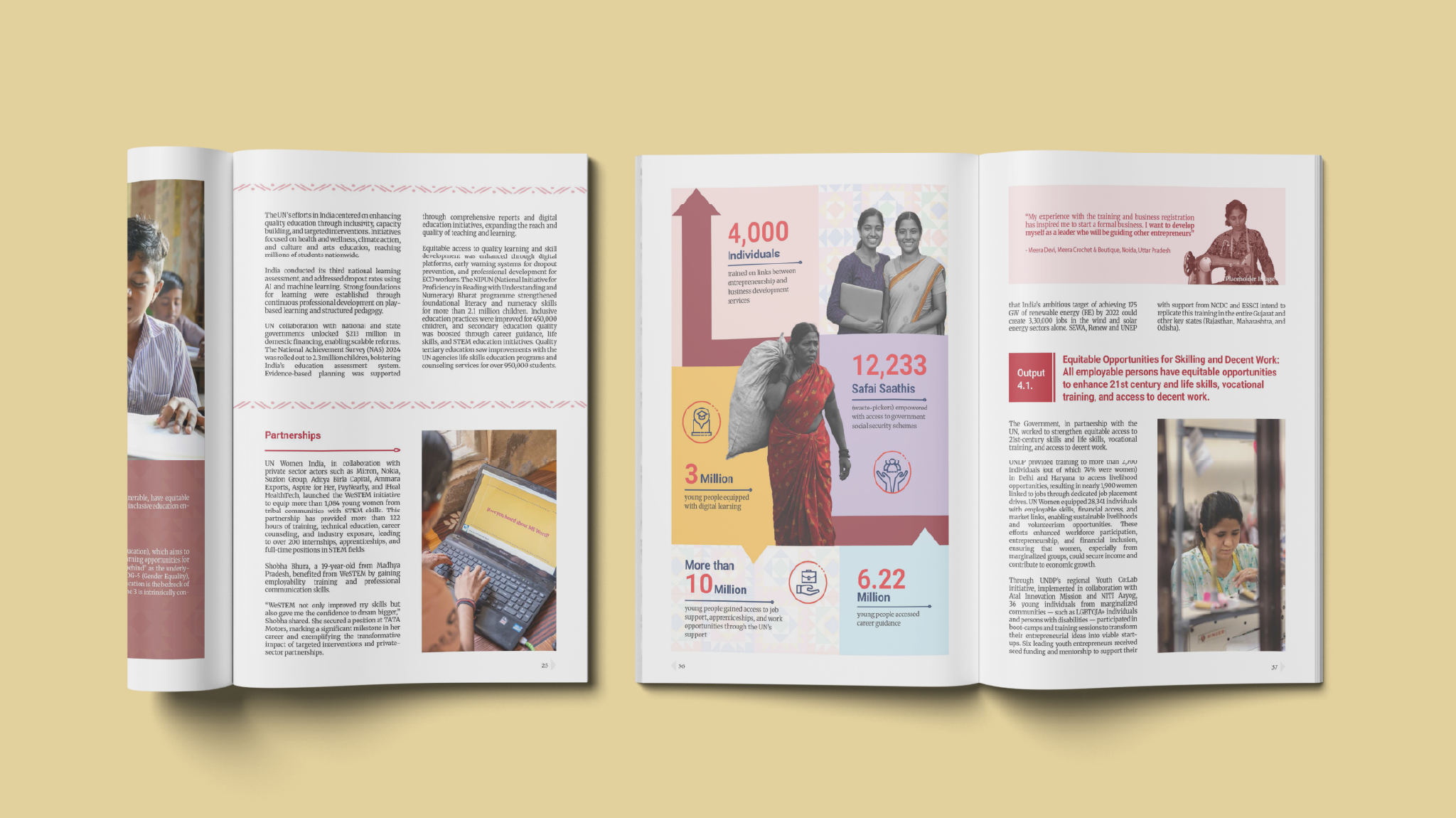 We collaborated closely with UN representatives to refine the visual direction of the 2024 report. Moving away from illustrative elements, we focused on a clean, photo-driven aesthetic that aligned with the UN’s brand guidelines while conveying a contemporary, India-relevant tone. Color palettes, typography, and layout structures were chosen to support visual consistency and clarity.